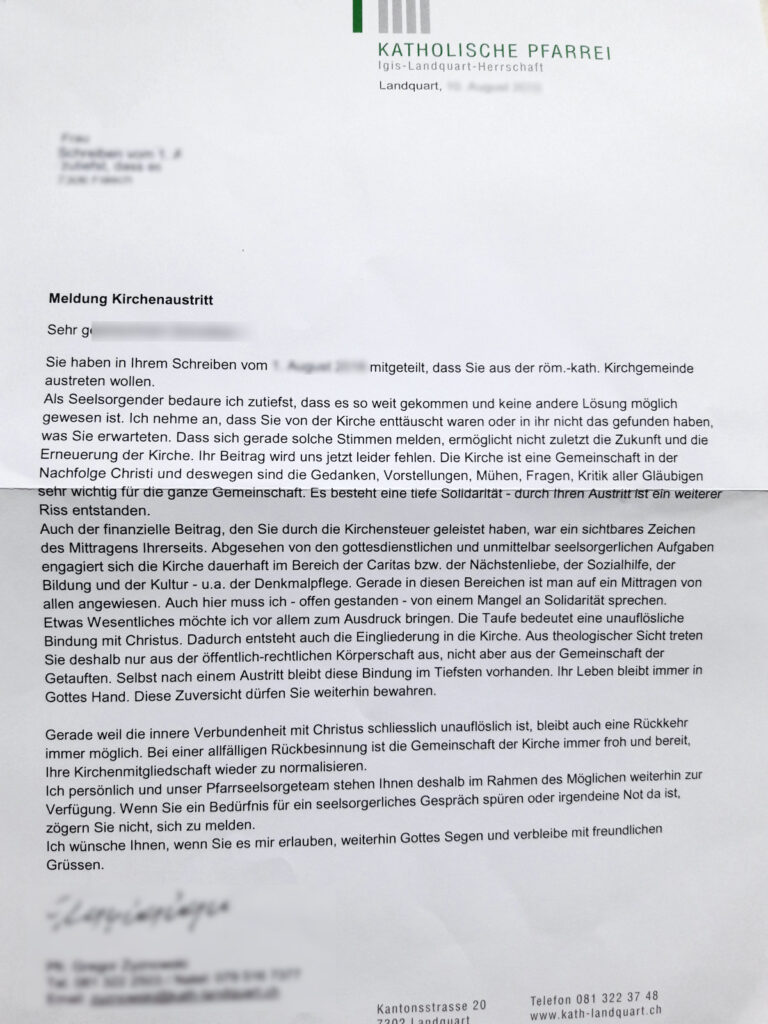 Die Redaktion fragte den Bischof: Was ist Ihre Meinung zum Austrittsbrief, den die Austretenden je nach Kirchgemeinde erhalten?